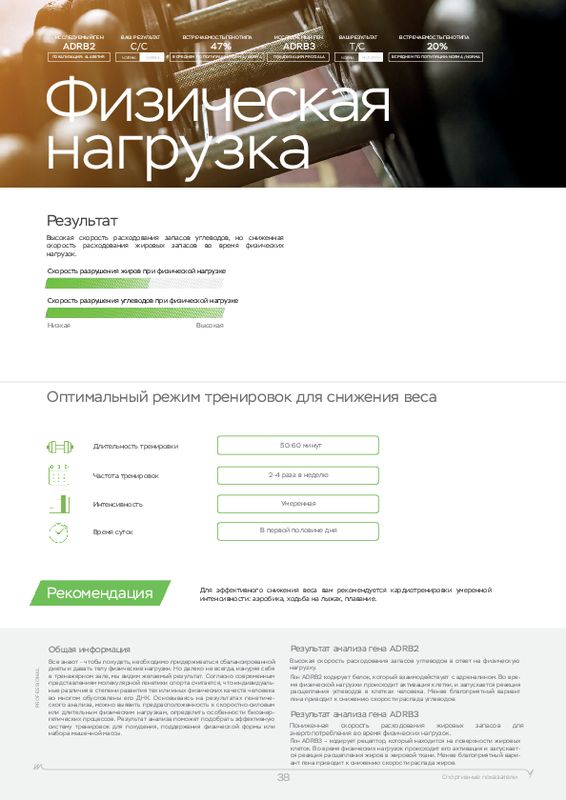 Этот ДНК анализ показывает, к каким физическим нагрузкам человек расположен генетически, а также какие продукты (содержащие определенные элементы) лучше употреблять в пищу. У каждого человека свои цели, кто-то хочет просто сбросить лишний вес, кто-то увеличить силу мышц, а кто-то нарастить огромные мускулы. Для получения максимальной отдачи от тренировок мы рекомендуем пройти наш генетический тест для фитнеса в Волосово.